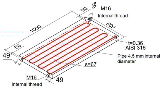 The cooling panel consists of a stainless-steel container with internal hydronic circuit (Figure 3). 80% of panel volume was filled with RUBITHERM© RT22HC phase change material. According to technical properties given by the manufacturer, the heat storage capacity of the PCM is 190 kJ/kg in the temperature range from 14 to 29 °C, which in theory would give the panel a heat storage capacity of around 1.48 kWh/m2 panel area. However, the operational temperature range of the panel will usually be from 19 to 24 °C. That gives a useful heat storage capacity of the PCM only 140 kJ/kg and the heat storage capacity of the panel 1.09 kWh/m2 panel area. At the beginning of each experiment, the PCM can be considered at a solid state (below the temperature of peak partial phase-change enthalpy).