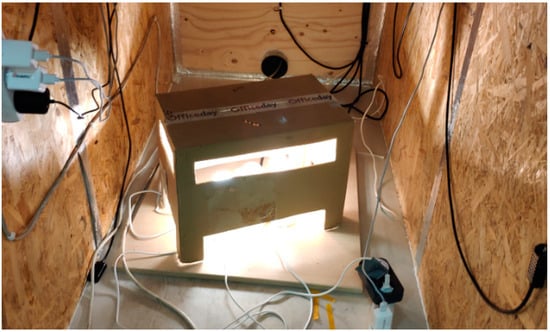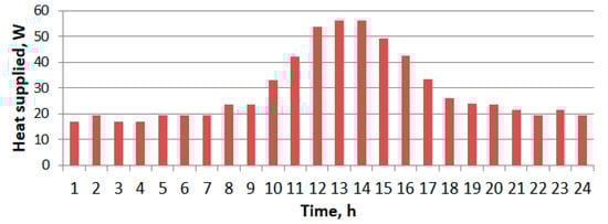 A heat source was introduced to simulate the performance of the cooling panel. The heat source was turned on and off with timers for 15 min cycles. The hourly average heat gains are visualized in Figure 4. To avoid a direct radiant heat transfer from heat sources to the cooling panel, the heat source was covered with a cardboard box (Figure 5). During experiments, the temperature of internal surfaces and the surfaces of the heat source was measured. Using the Stefan–Boltzmann law for net radiation heat loss (see Equation (2)) it was estimated that around 20% of heat exchange is radiant. It was assumed that the remaining 80% is convective heat exchange—this was later accounted for in the simulation model.
