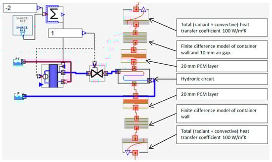 The cooling panel was modeled as a hydronic circuit thermally connected to PCM layers and container wall which was then exposed to the simulated zone with combined radiant and convective heat transfer coefficients. Graphical representation of the PCM panel simulation model can be observed in Figure 6.