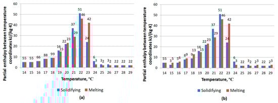 Another commonly applied method is the use of PCMto air heat exchanger that can be integrated in a hybrid ventilation and heating/cooling system. In this case, the problem of full solidification and melting can be overcome due to greatly increased heat transfer coefficients between the air and the PCM material as well as the heat transfer area by choosing a proper thickness of air passages and PCM layers [,,]. These types of systems mainly rely on recharging the PCM overnight. Thus, the PCM storage shall have the thermal capacity to store the cooling energy for a full day. The required PCM storage can be of a significant size for warm climates; for instance, some authors have reported that 700 kg PCM storage for a 100 m² residence is necessary to achieve the optimal indoor climate []. Moreover, it has been reported that in order to undergo full solidification of the PCM storage, the air flow rates in the heat exchangers have to be greatly increased. This can cause high fan energy consumption.