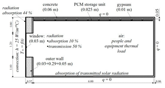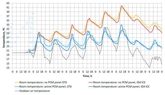 A similar approach was tried by a Latvian research team [,] that performed an extensive numerical analysis using computational fluid dynamics (CFD) modeling for steel panels with raw PCM. The estimated thermal storage capacity for the panel was 0.59 kWh/m² panel area and the phase change temperature was around 23 °C. The team modeled a room for 3 scenarios: