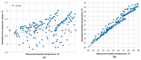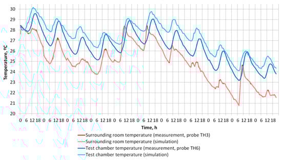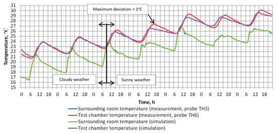 The geometrical dimensions and envelope parameters in the simulation were modeled as close as reasonably possible to the actual chamber. The measured heat loss coefficient Ht was used to finetune envelope U values of the simulated test chamber. During the simulation runs, the temperature of the surrounding environment in the simulation model was kept the same as the measured surrounding room temperature during the experiments. Only the radiant heat exchange between the surroundings and the chamber could not be precisely modeled because the surface temperatures and the short and long wave radiation sources (windows) were not measured during the experiments. Similarly, the cooling water temperature was also controlled according to the measured values.
