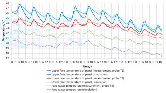 The combined radiant and convective heat transfer coefficients were adjusted during the model validation to 100 W/m2K—a relatively high value for natural convection; however, these coefficients did not significantly influence heat transfer from the hydronic circuit because it is mostly dependent on the relatively low heat conductivity of the PCM material (λ = 0.2 W/mK). Furthermore, the area of the lower face of the panel was increased from 0.5 m2 to 0.65 m2 in order to account for the full surface area of the panel including the small side walls.