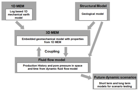3D MEM uses the workflow illustrated in Figure 3. The subsurface geometry consisting of faults and lithostratigraphic layers is adopted from the geological/structural model which in turn is usually based on seismic and well data. The 3D MEM is then populated with material properties calculated from the log-based 1D MEM approach described above. This upscaling of properties from the various 1D MEM’s of the individual wells to the 3D MEM can be achieved through geostatistical methods such as the Gaussian and Kriging interpolation method [11]. If available, information from seismic amplitude versus offset (AVO) analysis which captures lithological changes can be used to populate the 3D MEM [7]. The final 3D MEM is discretized, and finite element (FE) techniques are applied to calculate stresses and strains in the model domain. In an iterative process similar to the 1D MEM, the calculated stresses are compared to observed stress data now from wells of the entire model domain. If a satisfactory fit is achieved, this model is regarded as validated in mechanical terms and can be used for coupling with the fluid flow model.