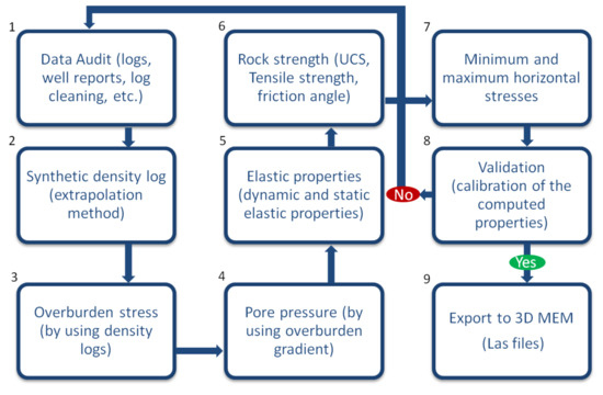 1D mechanical earth modeling (1D MEM) is the numerical representation of rock mechanical properties and the state of in situ stresses along a borehole [12]. Therefore, well log data are used to obtain various material properties and estimates for pore pressure and in situ stress along a wellbore section assuming a poro-elastic approach. The quality of a 1D MEM model depends on the availability of well log data and the availability of laboratory tests on cores for calibration. The complete 1D MEM modeling scheme (step by step) is presented in Figure 2.