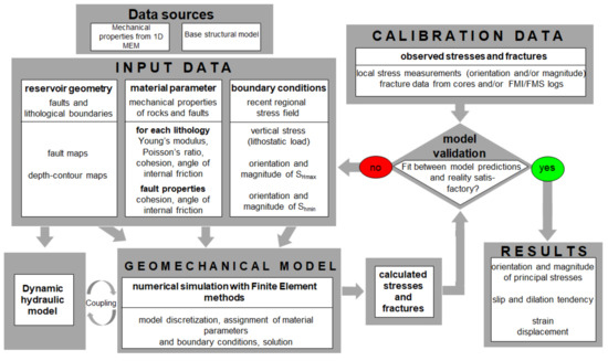 3D geomechanical modeling workflow including input data sources, validation and calibration. Modified after Henk et al. [7]. If model validation fails, revised input parameters considering uncertainties in measurements have to be taken into account for the next model’s iteration.