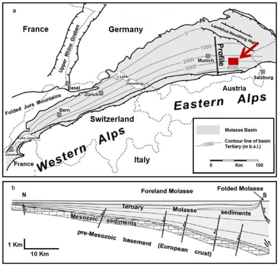 - Bachmann, G.; Muller, M.; Weggen, K. Evolution of the Molasse Basin (Germany, Switzerland). Tectonophysics 1987, 137, 77–92. [Google Scholar] [CrossRef]