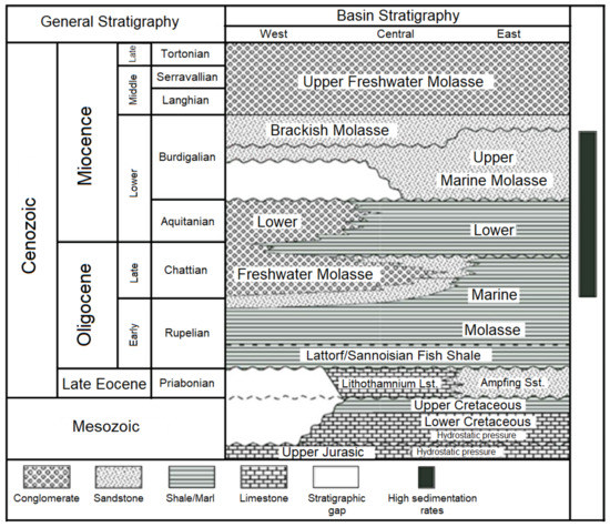Stratigraphic overview of the Bavarian Molasse Basin along with the Mesozoic sub-Molasse succession [28]. High sedimentation rates correspond to distinct tectonic events in the Molasse Basin in Bavaria [10,30,31,32]. Reprint with permission [Michael et al.], 2018, Elsevier.
