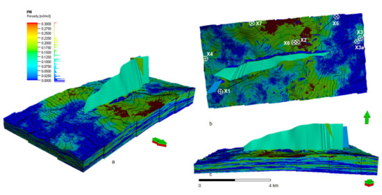 The 3D structural model of the case study reservoir with three main faults. (a). Oblique view, (b). top map view at depth of 1200 m, and (c). east-west cross-sectional view. The model shows the porosity distribution throughout the reservoir area (arrows point northward).