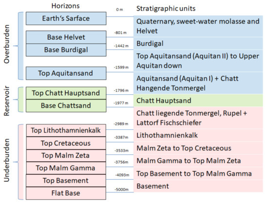 As the 3D MEM does not only comprise the reservoir but has to incorporate the entire overburden up to the earth’s surface as well as part of the underburden, some information on the geological setting of the case study has to be gathered. The wedged-shaped fill of the Molasse basin consists of Cenozoic sediments that are underlain by Mesozoic strata (Triassic to Cretaceous limestones and sandstones) and crystalline basement rocks of the European plate (Figure 4b and Figure 5). The maximum thickness of the basin fill is about 6 km in the South and progressively decreases towards the North. The Molasse Basin proper developed from Late Eocene to Late Miocene times during the late stage of the Alpine orogeny. Major subsidence took place during Oligocene and Lower Miocene time which lead to rapid sedimentation in the basin [10]. The deposition of pelitic deposits occurred during Early Oligocene (Rupelian) due to shallow to deep marine settings. Then, a subsequent sea level fall resulted in the deposition of terrestrial to coastal facies which formed Aquitanian and Chattian sand during the Late Oligocene to Lower Miocene [28]. The sea level rise during Lower Miocene resumes the marine settings again in the Molasse basin, which resulted in the deposition of marine and tidal deposits (Burdigalian deposits). During Middle to Late Miocene, the terrestrial and fluvial environment replaced the marine settings leading to the formation of the Upper Freshwater Molasse [28]. The sedimentary rocks in the Molasse Basin provide a source and reservoir as well as seal rocks for hydrocarbon reservoirs [29]. However, only small oil and gas fields have been found in the German part of the Molasse basin. Most of these hydrocarbon fields have been depleted by now and some are considered for underground gas storage projects.