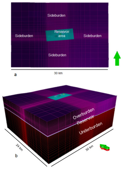 Reservoir model proper embedded in 3D geomechanical model with reservoir, overburden, underburden, and sideburden zones. (a) is the top view and (b) is the oblique view (arrows point northward).