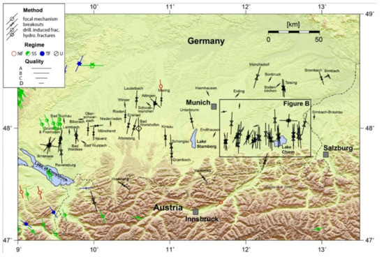 Orientation of the maximum horizontal stress in the Molasse Basin in southern Germany. The box represents the area of interest (modified after [4]). Reprint with permission [Reinecker et al.], 2010, Elsevier.