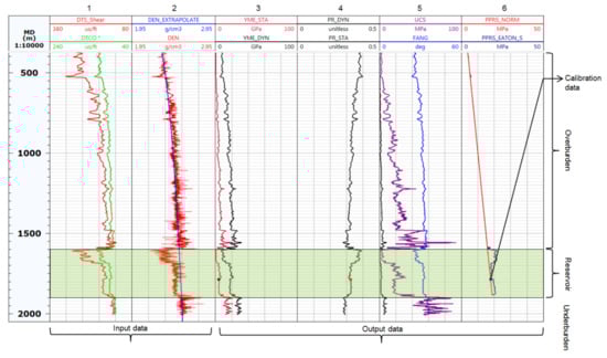 The pore pressure is a key parameter required to determine effective stresses in 1D MEM. Various methods and correlations have been put forward to get a pore pressure profile (see [13]), but the most popular one providing reasonable results is Eaton’s method [14]. Either compressional slowness from sonic logs (Equation (3)) or resistivity from corresponding electric logs (Equation (4)) can be used to calculate pore pressure by using Eaton’s method.