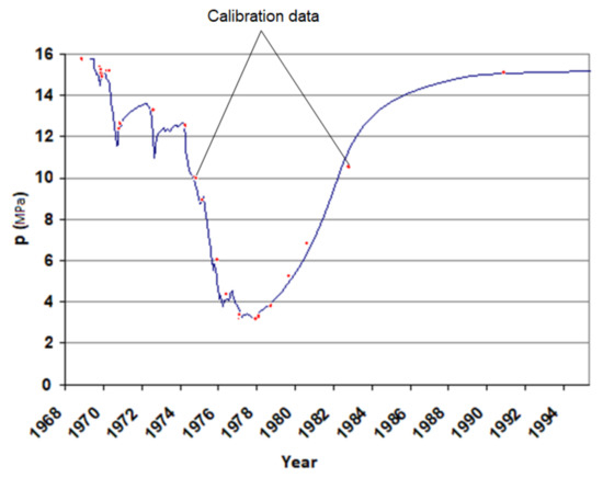 Some calibration data for the geomechanical as well as the fluid flow modeling are available. Laboratory tests such as triaxial tests were carried out on the core samples of X6 taken at reservoir level which lead to average values of 4.18 GPa for static Young’s modulus (), 0.35 for static Poisson’s ratio () and 0.82 for the Biot coefficient α [27]. While the data can be used to calibrate the empirical correlations used to find mechanical properties in 1D MEM, stress magnitudes of 38.2 MPa and 36.7 MPa observed at reservoir level of well X6 for SHmax and Shmin [33] are used to constrain the stresses calculated by the 3D MEM. For calibration of the fluid flow simulation, the evolution of the reservoir pressure at well X6 from 1969 to present is available.