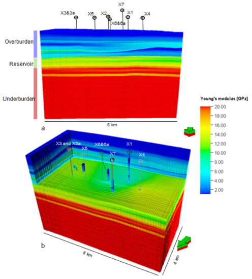 Petrophysical properties, such as porosity and permeability, were updated in the 3D geomechanical model from the dynamic model through history matching. The mechanical properties were upscaled and populated by the Kriging method [11]. The spatial distribution of Young’s modulus is presented in Figure 12. The mechanical properties indicate distinct vertical variations, but only slight lateral changes due to changes in lithology. The static Young’s modulus in the overburden ranges from 2 GPa to ~8 GPa near the bottom. The western and eastern part of the top reservoir layer shows higher Young’s moduli of about 10 to 12 GPa, which increase to the east where they reach up to 16 GPa. The average value of the Young’s modulus decreases up to 6 to 8 GPa in the middle part of the reservoir near wells X6, X6a, and X1. The higher Young’s modulus and lower Poisson ratio in the eastern part of the reservoir indicate more shaley lithologies in this area. In contrast, the decrease in Young’s modulus and increase in Poisson ratio in the middle and western part indicate the presence of more sandstones than in the eastern part of reservoir. The higher Young’s modulus in the underburden area may be due to higher compaction and presence of basement rocks close to the base of model.