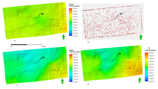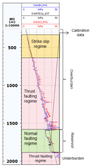 The stress state in the 3D MEM was achieved by calibrating minimum and maximum horizontal stresses by iterative adjustment of strain increments (both minimum and maximum strains). The calibrated stresses are shown in Figure 13 for well X6. The reservoir zone lies in a normal faulting regime as the vertical stress (= S1) is larger than the maximum horizontal stress (= S2) which in turn is larger than the minimum horizontal stress (= S3). The calibration points match the calculated stresses, i.e., 38.2 MPa and 36.7 MPa for and , respectively [33]. Likewise, the calculated vertical stress MPa in the reservoir zone fits the observed vertical stress of 42.2 MPa from [33]. However, the vertical stress in large parts of the underburden and overburden sections becomes the smallest among the principal stresses which means a thust faulting regime above and below the reservoir. The stress state in the section above 600 m (below sea level) to the surface is > > making it a strike-slip region. The abrupt changes in the tectonic regime with depth are a consequence of the different mechanical properties in the model domain.
