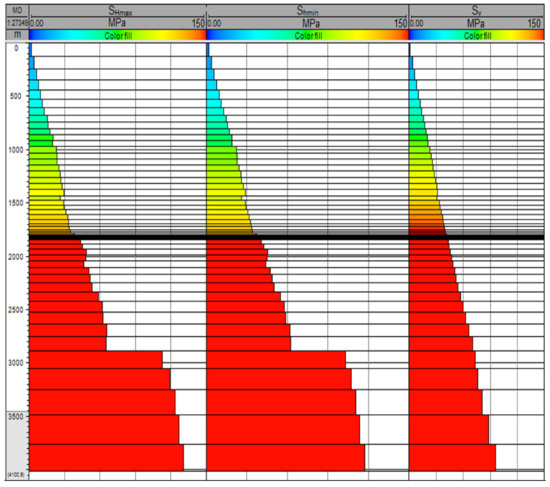 Figure 10 shows the results of Well X6 with calibration data as an example for the 1D MEM output. Shear velocity was calculated by using the Greenberg and Castagna correlation (Equation (7)) [17]. The density log along with compressional and shear slowness were used to calculate dynamic and static elastic properties by using the Bradford correlation. The average elastic Young’s modulus and Poisson’s ratio are 4 GPa and 0.35, respectively, at the X6 location at a depth of about 1786 m. The calculated material properties were calibrated using laboratory measurements. The pore pressure was calibrated first to get a gradient profile matching the calibration point at corresponding depth. Both calculated and measured pressures of 16 MPa coincide at a depth of 1786 m. The pore pressure profile follows the hydrostatic pressure until the top of the reservoir section, which shows an over-pressured zone slightly surpassing the hydrostatic pressure by 5 MPa. The elastic properties at the same depth were also calibrated against measured data. At last, the horizontal stresses were calculated using a poro-elastic approach and calibrated against measured stresses by using strain increments (Equations (14) and (15)) i.e., 0.0009 and = 0.0012.