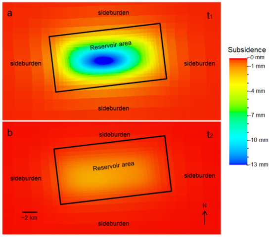 Subsidence predicted at the ground surface above reservoir during depletion (t1) and replenishment (t2) relative to pre-production time. The box indicates the location of the reservoir model proper embedded in the larger geomechanical model. (a) the maximum depletion time step; (b) the maximum replenishment time step.