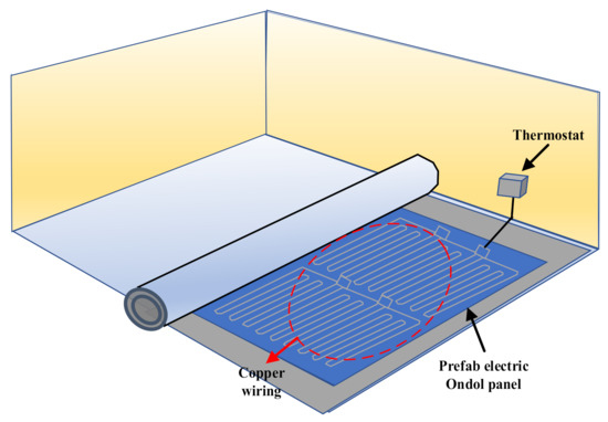 In general, the Ondol system was constructed by the wet construction method on site. Nowadays, the modular construction method with prefab Ondol panels is increasingly adapted in residential buildings to enhance the construction quality and shorten the construction period [26]. The use of prefab Ondol panels can make buildings lighter than those made by the wet construction method as well as provide an opportunity to reduce construction waste [27]. While most prefab Ondol panels have used hot water from boilers fueled by natural gas or oil, another type of Ondol panel system using electricity was proposed as shown in Figure 1. According to the study of Jeong, about 10% of total energy-saving was achieved by using the prefab electric Ondol system [28]. However, there are a few studies about the performance of the prefab electric Ondol panels. To assess the performance of the prefab electric Ondol panels more accurately, the present study compared the performance of the prefab electric Ondol panels with the conventional Ondol systems in residential buildings.