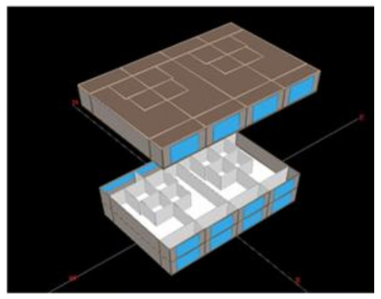 To assess the energy performance of the prefab electric Ondol panels, the energy simulation was performed by using eQuest 3.61, which is the comprehensive energy simulation tool to evaluate design parameters of energy conservation measures as well as provide detailed information of building energy use [29]. Using this software, the reference apartment building was modeled as shown in Figure 3. In addition, the energy simulation was performed by using the specification of the reference building in Table 1. The residential building was operated for 24 hours and the HVAC system ran between 5 pm to 7 am. Moreover, the design temperatures for heating and cooling were set at 20 °C and 26 °C, respectively. For the conventional Ondol system, a central water-to-water heat pump system was modeled for providing hot water, while the data obtained from the measurement were used for the prefab electric ondol model. The annual energy consumption of the unit by using the conventional Ondol system fueled by natural gas was compared with that operated by the prefab electric Ondol panels. For the simulation, the TMY weather data of Seoul in South Korea was utilized. The mean air temperature in Seoul was about 13 °C. The lowest and highest air temperatures were −12.6 °C and 35.4 °C, respectively. The mean wind speed was 2.2 m/s.