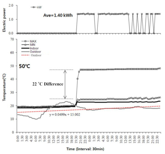 Figure 4 shows the air temperature distributions of the surface on the floor and the indoor and outdoor on May 2nd and 3rd. From 0 to 19:30 h on May 2nd, the heating was off and the indoor air temperature and the surface temperature on the floor were maintained at about 19.5 °C because of the thermal capacity of the building envelopes. From 19:30 h on May 2nd to 24 h on May 3rd, heating was provided by using the prefab electric Ondol panels. While the setpoint temperature for the Ondol panels was set at 60 °C at full-load, the maximum surface temperature on the floor was maintained at about 50 °C. In addition, the minimum surface temperature on the floor was about 28 °C. Even though the surface temperature on the floor was increased about 7 °C by the operation of the Ondol panels, the increase in the indoor air temperature was only about 4 °C with/without the Ondol panels. Thus, the indoor air temperature was about 24 °C. The operation of the Ondol panels took 1.4 kWh of electricity. Moreover, the surface temperature on the floor was visualized by using the thermal imaging camera (Figure 5). As shown in Figure 4, the maximum and minimum surface temperature difference was more than 20 °C and the surface temperature was higher than the indoor air temperature. It can be seen that water from conventional Ondol systems can transfer radiant and convective heat into the indoor fully because of higher heat capacity of water than that of air, while the electric Ondol panels only heated the floor directly. This caused the lower indoor air temperature than the surface temperature on the floor.