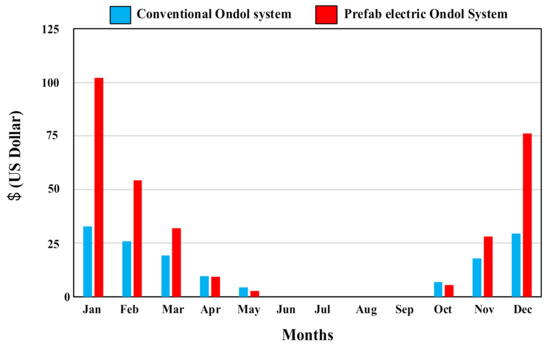 Considering the heating energy consumption, the annual heating cost for the conventional Ondol system and the prefab electric Ondol panel system was analyzed for 8 months (October to May) (Figure 6). Table 4 and Table 5 show the heating energy consumption and the cost of these two heating methods. The total heating cost for the conventional Ondol system and the prefab electric Ondol system were $140.5 (US dollar) and $313.2 (US dollar), respectively. As a result, the prefab electric Ondol system requires about 53% of the additional heating cost.