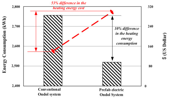 As shown in Figure 7, the use of the prefab electric Ondol panels cost 50% more than that of the conventional Ondol system, while the heating energy consumption of the prefab electric Ondol system was about 8.6% lower than that of the conventional Ondol system. This was caused by the progressive electricity billing during the winter period (December to February) in South Korea, while the price of natural gas was the flat rate. Therefore, it requires to find out the criteria for assessing the performance of the prefab electric Ondol panel system more accurately.