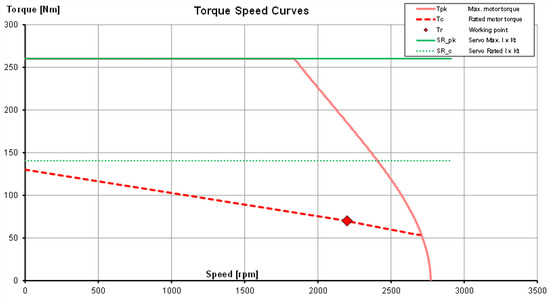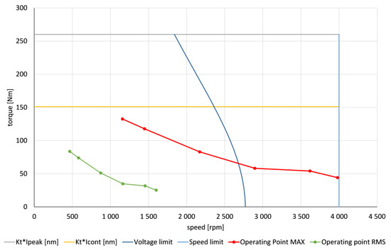 As a result of the software calculations, information is obtained regarding exceeding the permissible motor values (speed, torque, current, power). The calculated operating points of the drive are compared with the limit characteristics of the motor (and converter) on the graph of the torque dependence on the motor speed (Figure 9). When choosing the motor and converter, it is necessary to choose devices that will provide appropriate values for maximum current, effective current, electrical power and voltage at the terminals. Exceeding the maximum voltage values at the motor terminals and DC bus is permissible when switching to the appropriate motor control ensuring torque limit and de-excitation (reduction of the resultant excitation field in the machine).