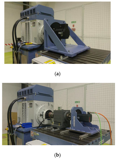Permanent magnet motor mounted on the test bench of the dynamometer: (a) for hoist drive, (b) for the drive with the gear of jib rotation and trolley travel.
