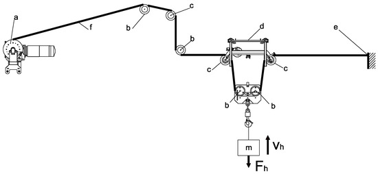 The hoist drive consists of the main winch (electric motor, brake, gear, and rope drum) as well as the rope, trolley, hook block, rope wheels and rope attachment point (swivel). The diagram of the main hoist rope is shown in Figure 6. The rope is attached to the hoist drum (a), passing through the cast iron (b) and polyamide (c) wheels on the turntable. Then, the rope is slung over the rope wheels in the hook block and the trolley (d). The end of the rope is attached to the last jib segment (e). The hoist-drive system is equipped with an electromagnetic drum brake to maintain the loads when stopped, but also during an over-speed operation phase.