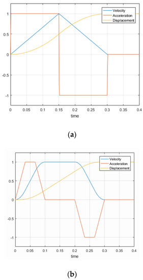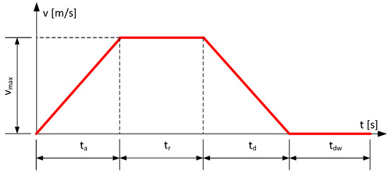 The movement profile expresses the shape of speed changes during the work cycle and provides a basis for calculating the load torques and selecting the appropriate motor. Several basic shapes of motor speed changes during operation are assumed: trapezoidal, triangular or according to the movement profile with a trapezoidal shape of speed consists of three phases of work: acceleration, work at a constant speed and braking. A special case of the trapezoidal profile is the triangular profile, which eliminates the stage of work at a constant speed—Figure 7. Consequently, the triangular profile consists of only two stages of work: acceleration and braking. As a result, adopting a triangular profile results in higher maximum speeds with smaller accelerations at the same time (Figure 8a). The use of speed changes according to the trapezoidal or triangular profile allows us to easily determine the acceleration and change the position of the displaced load. As a consequence of the trapezoidal or triangular profile of velocity changes, uncontrolled vibrations occur (associated with the lack of limitation of acceleration changes (jerk). Theoretically, the rate of acceleration changes reaches infinitely large values. To reduce vibrations, it is recommended to use the velocity profile described employing s-curves with limitation of acceleration changes (Figure 8b).