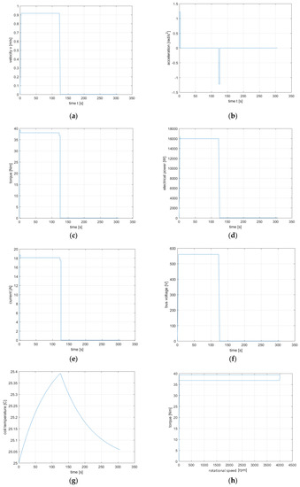 The work cycle of the main electric drive of the tower crane: (a) velocity waveform, (b) acceleration waveform, (c) torque waveform, (d) electrical power waveform, (e) current waveform, (f) bus-voltage waveform, (g) motor coil temperature, (h) mechanical characteristic.