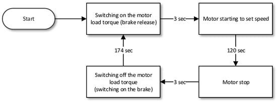 Experimental studies were carried out for the following cycle: trapezoidal speed waveform in which the rise time, constant speed 1560 rpm, constant torque 37 Nm and braking time are the same and amount to 15s. The set stopping time is the 30 s. The braking moment is applied during acceleration and deceleration and taken off while driving at a constant speed (Figure 22).