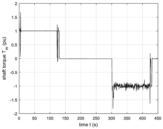 An important feature of the crosshead’s work is the need to accelerate and slow down a heavy load (inertia), which may tend to rock. The impact of uncontrolled weight swings was modelled by setting the appropriate torque. During the acceleration and deceleration phase, a sinusoidal variable with an amplitude of 2.5 × Tust was added, as shown in Figure 19.
