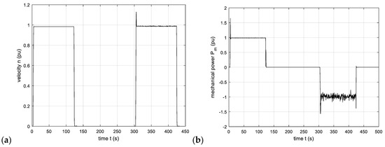 The mechanical power (Figure 16b) is calculated as the product of the rotational speed and torque measured by the dynamometer. The positive value of torque and mechanical power means the work of the crane when lifting the weight, negative values correspond to lowering the weight.