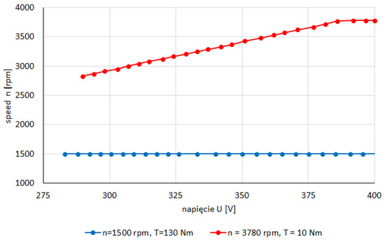 The outcomes of those tests are presented in Figure 18. At the first load level A, the drive operated at a set speed across the entire voltage range (280–400 V). In the case of the second load level B, the drive operated at a set speed at a voltage above 380 V. A drop in supply voltage below 380 V caused a decrease in motor speed. At 290 V, the motor speed dropped to 2830 rpm, with active power limited to 3 kW. This only shows the drive performance and its limit regarding the deexcited operation.