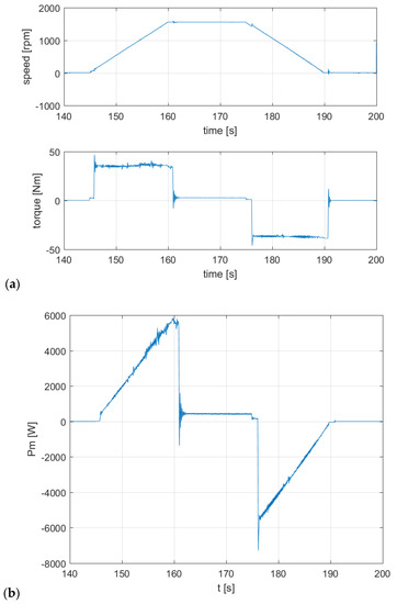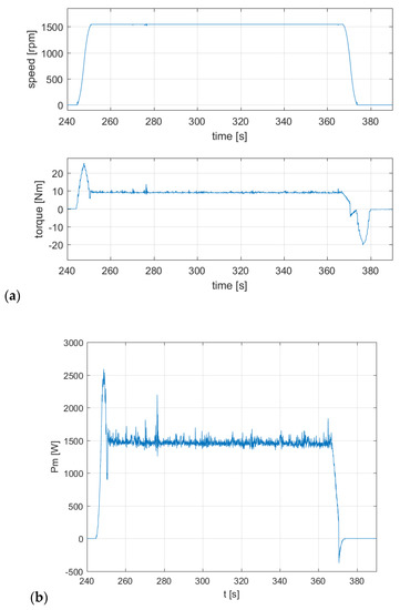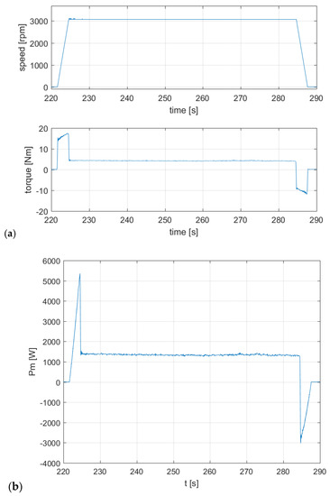 The waveforms of speed and mechanical moment and mechanical power recorded for A cycle on the shaft of the tested motor are, shown in Figure 21. The efficiency of the electric drive system working in cycle A is 75.5% (Table 5). Despite the greater mechanical losses (higher rotational speed), the drive works by consuming less current and, therefore, less active losses in the windings. As a result, the efficiency in this cycle is less than in cycle C but greater than in cycle B.