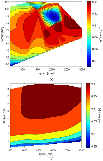 However, based on the developed charts (Figure 24a) it can be stated concerning the main drive that the efficiency of the tested motor for loads below the rated torque (Tn = 70 Nm) is on average 91% (at maximum, 94%) which corresponds to class IE3 (premium efficiency) or IE4 (super premium efficiency) for this machine power.