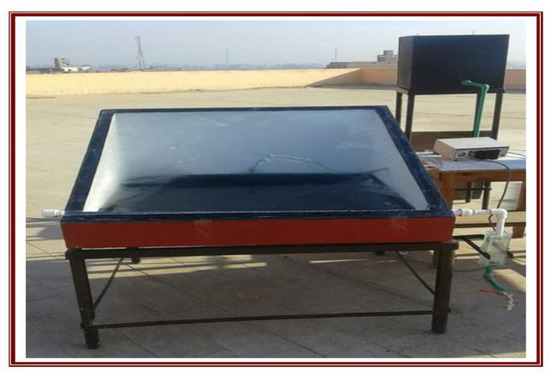 The basin-type solar still, single-slope solar still (SSSS) consisted of an airtight basin, manufactured from galvanized iron material with dimensions of 1000 × 1000 mm, which held the saltwater. To avoid the saltwater spilling outside the basin to the condensate duct and the contact of this duct with the saltwater and with the condensing glass cover, the elevation of the frontal vertical side of the still was set at 100 mm, while the elevation of the high vertical side was set at 525 mm. The top of the condensing cover was made of window glass with a thickness of 3 mm. It was fixed to the top of the still vertical walls with silicon rubber glue along all the perimeter sides of the glass. The slope angle of the still cover was 23°. The inner surface of the base of the still basin was painted black in order to enable absorbing the largest amount of solar radiation. The other interior faces (back, front, and two side walls) of the still were painted with white paint to enhance the reflection of solar radiation to the basin water the base. The frame of the still was made of wooden sheets. An insulating layer of 50 mm thickness also made of wooden chips was used to decrease the amount of heat lost from the still to the atmosphere, and this layer was placed in the space between the still outer frontal, back, and side wall, and the wooden frame interior.