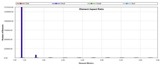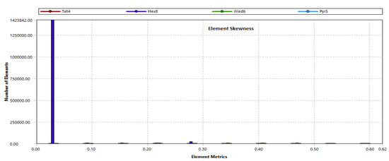 Figure 6 shows that most of the elements had a value of an aspect ratio less than 2. This indicates that the generated mesh, which had mostly hexahedron elements, was a good quality mesh from the point of view of skewness as well as the aspect ratio.