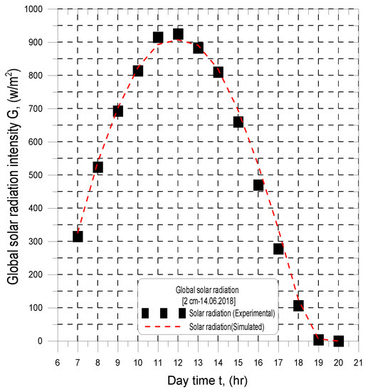 Figure 7 displays the global intensity of solar radiation for the simulated and measured data. Referring to