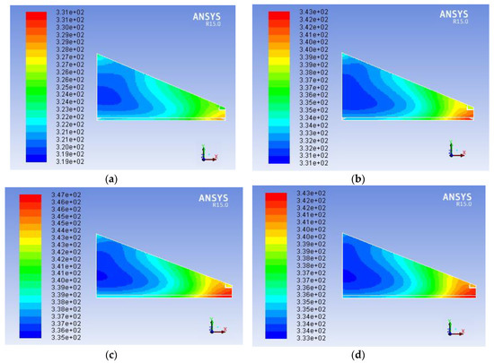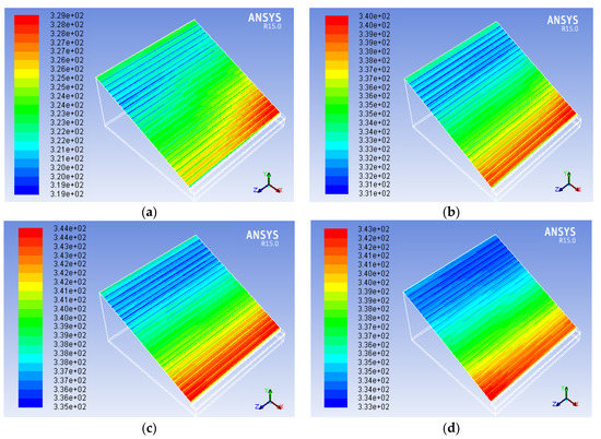 Figure 8. The color coding of the temperature is also shown on the charts. The minimum and the maximum temperatures are in Kelvin. The “blue” color shows the minimum value of the temperatures and the “red” color shows the maximum value. The contours of the absorber plate temperature charts show that: