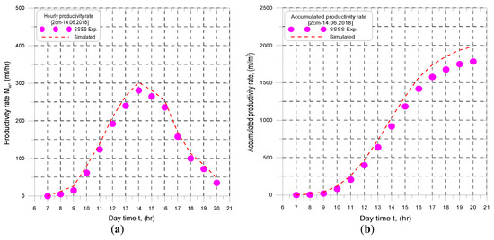 Figure 13a,b presents a comparison between the values of the hourly and accumulated productivities, obtained using the developed CFD model and those measured for the studied still with a water depth of 2 cm. The results indicated that the daily simulated and experimental accumulated productivities were 1.982 and 1.785 L/m