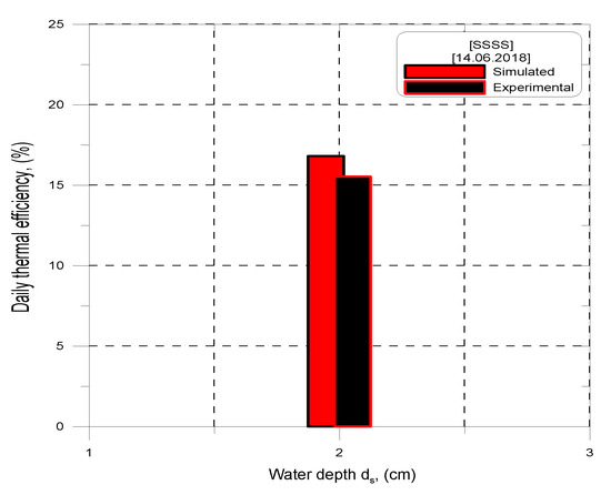 Figure 15 illustrates the daily simulated and experimental efficiency of the studied still. The experimental daily quantity of the efficiency was a bit smaller than the simulated quantity, which displays acceptable agreement among simulated and experimental values with a maximum difference of 8.3%. The experimental efficiency was lower than the simulated efficiency because of possible leakage of vapor.