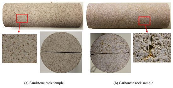 Figure 1. Images of rock samples used in this study. (a) Left: sandstone rock sample having a relatively homogeneous matrix. (b) Right: carbonate rock sample with heterogeneous matrix and vuggy porosity.