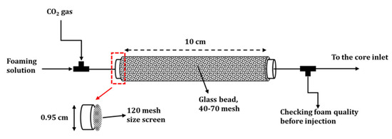 A foam generator was designed and used for foam injection in rock samples. The foam generator was made of glass beads with 40–70 mesh sizes (210–400 microns) packed inside a metal tube (10 cm and 0.95 cm in length and diameter, respectively). Both sides of the tube were sealed with 120 mesh size (125 microns) screens. The schematic of the foam generator is shown in Figure 2. The foaming solution was first injected into the foam generator to minimize chemical absorption. Thereafter, the foam/PEF solution and CO2 gas were co-injected, and generated foam/PEF was visualized after the foam generator to inspect the quality of the foam before entering the rock samples.