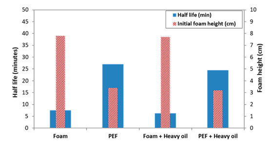Figure 4. Bulk foamability and stability (half-life) of foam and polymer enhanced foam (PEF) in the presence and the absence of heavy crude oil.