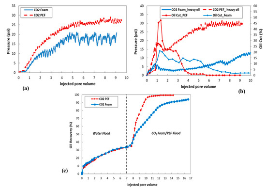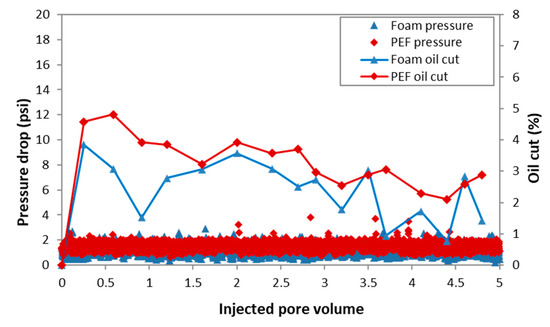 In the presence of bypassed heavy oil (after waterflood), CO2 PEF showed significant resistance to flow compared to that of CO2 foam (Figure 5b) inferred from higher injection pressure. The first peak in the pressure profile (Figure 5b was around 1 PV) was due to oil bank creation and movement, as shown by the oil cut profiles. After oil bank production, CO2 PEF propagated much faster compared to that of foam and reached a steady state at around 6 PVs. The CO2 foam propagation was slower and never reached the steady-state pressure, even after the injection of 10 pore volumes.