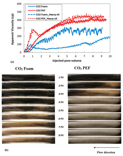 Foam apparent viscosity is one of the key factors for foam EOR as a mobility control agent. The apparent viscosity is calculated from the Darcy equation to show the effectiveness of foam in porous media, where the higher apparent viscosity means more stable foam and a higher chance of increasing oil recovery. As seen in Figure 9a, CO2 PEF had a higher apparent viscosity than foam both in the water-saturated and heavy oil saturated sandpack. In water-saturated media, CO2 PEF apparent viscosity (100 cp) was almost double than that of CO2 foam after one pore volume of injection. Unlike CO2 foam, CO2 PEF apparent viscosity was very similar both in the water-saturated and oil-saturated media, showing that PEF is resistant to heavy oil. This behavior can be seen in the sweep efficiency of foam and PEF (Figure 9b). Visual images of the sandpack showed most of the oil was displaced after about 4 PVs with piston-like displacement during CO2 PEF injection. However, in the case of CO2 foam, most of the oil was left behind with poor sweep efficiency.
