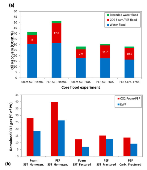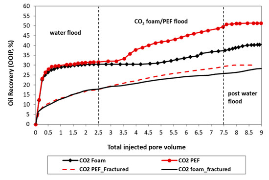 PEF had better performance in both homogeneous and heterogeneous rock samples compared to that of foam injection. According to Figure 11a, the heavy oil recovery (OOIP) by CO2 PEF was 17.8% and 11.7% for the homogenous and fractured rock samples, respectively. This value was 8% and 7.9% for CO2 foam flooding. Moreover, extended waterflood after foam/PEF injection produced more oil, showing that foam bubbles are relatively effective in fluid diversion in the porous media, and injected water could reach untouched parts of the rock.
